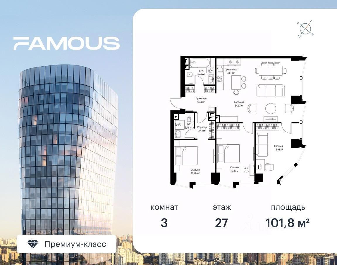 Продаётся 3-комнатная квартира площадью 101.80 м² с предчистовой отделкой на 27-м этаже премиального небоскреба Famous.
