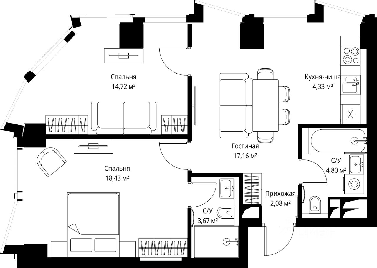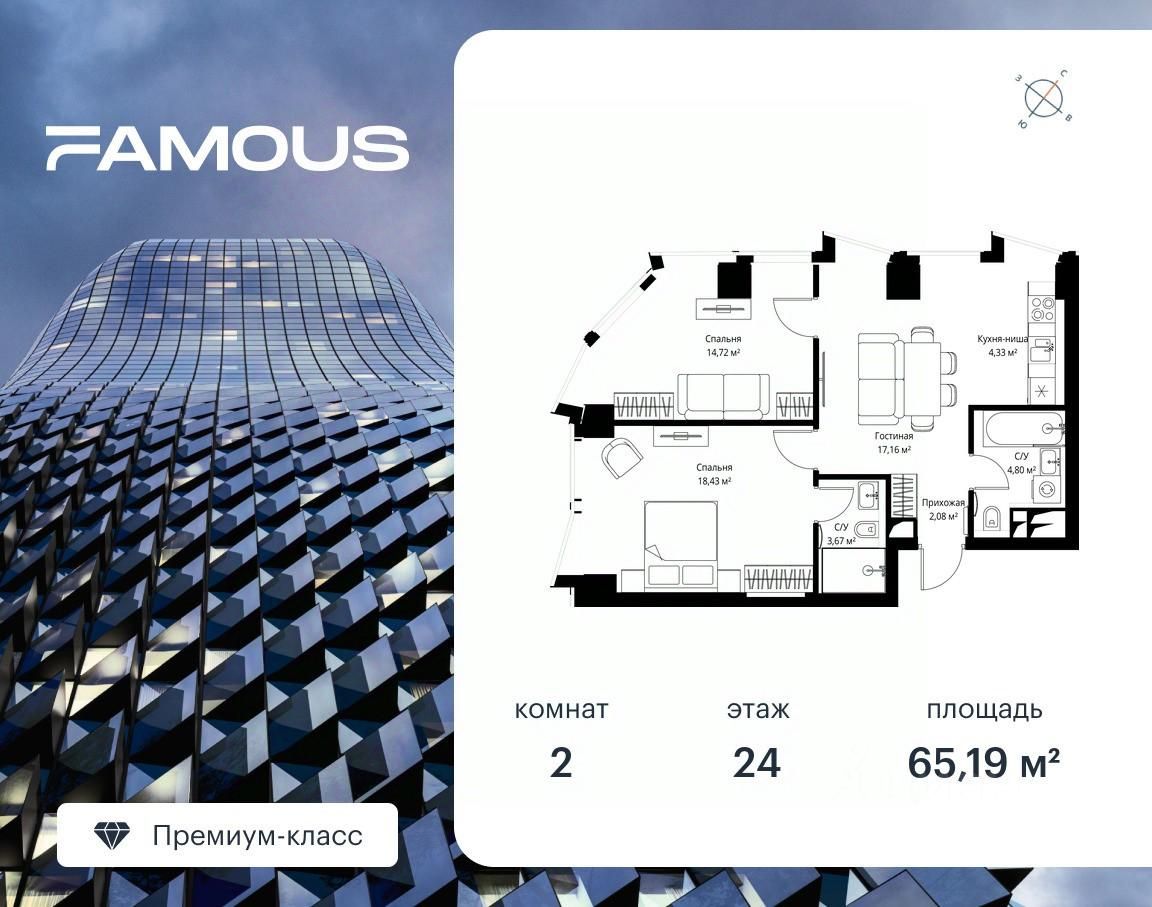 Продаётся 2-комнатная квартира площадью 65.19 м² с предчистовой отделкой на 24-м этаже премиального небоскреба Famous.