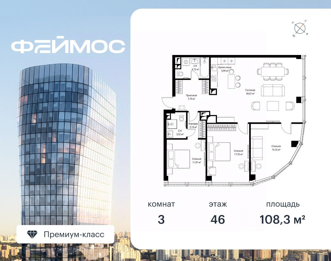 Продаётся 3-комнатная квартира площадью 108.30 м² с предчистовой отделкой на 46-м этаже премиального небоскреба Феймос.