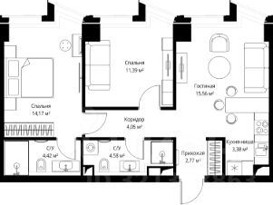 Продаётся 2-комнатная квартира площадью 60.32 м² с предчистовой отделкой на 20-м этаже премиального небоскреба Famous.