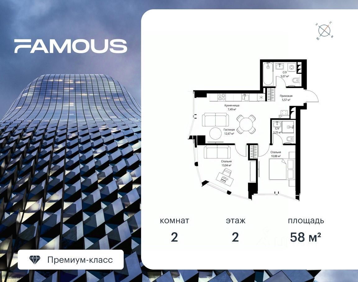 Продаётся 2-комнатная квартира площадью 58 м² с предчистовой отделкой на 2-м этаже премиального небоскреба Famous.