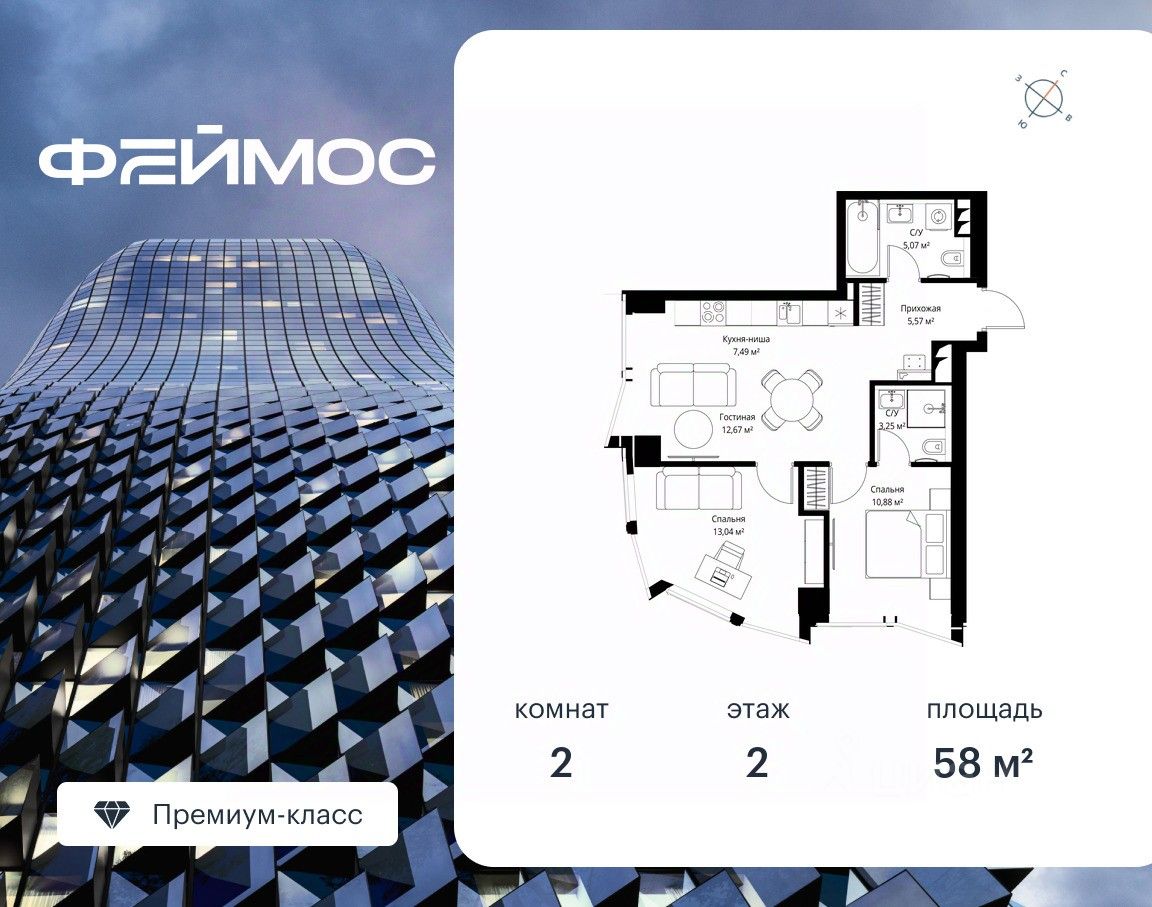 Продаётся 2-комнатная квартира площадью 58 м² с предчистовой отделкой на 2-м этаже премиального небоскреба Феймос.