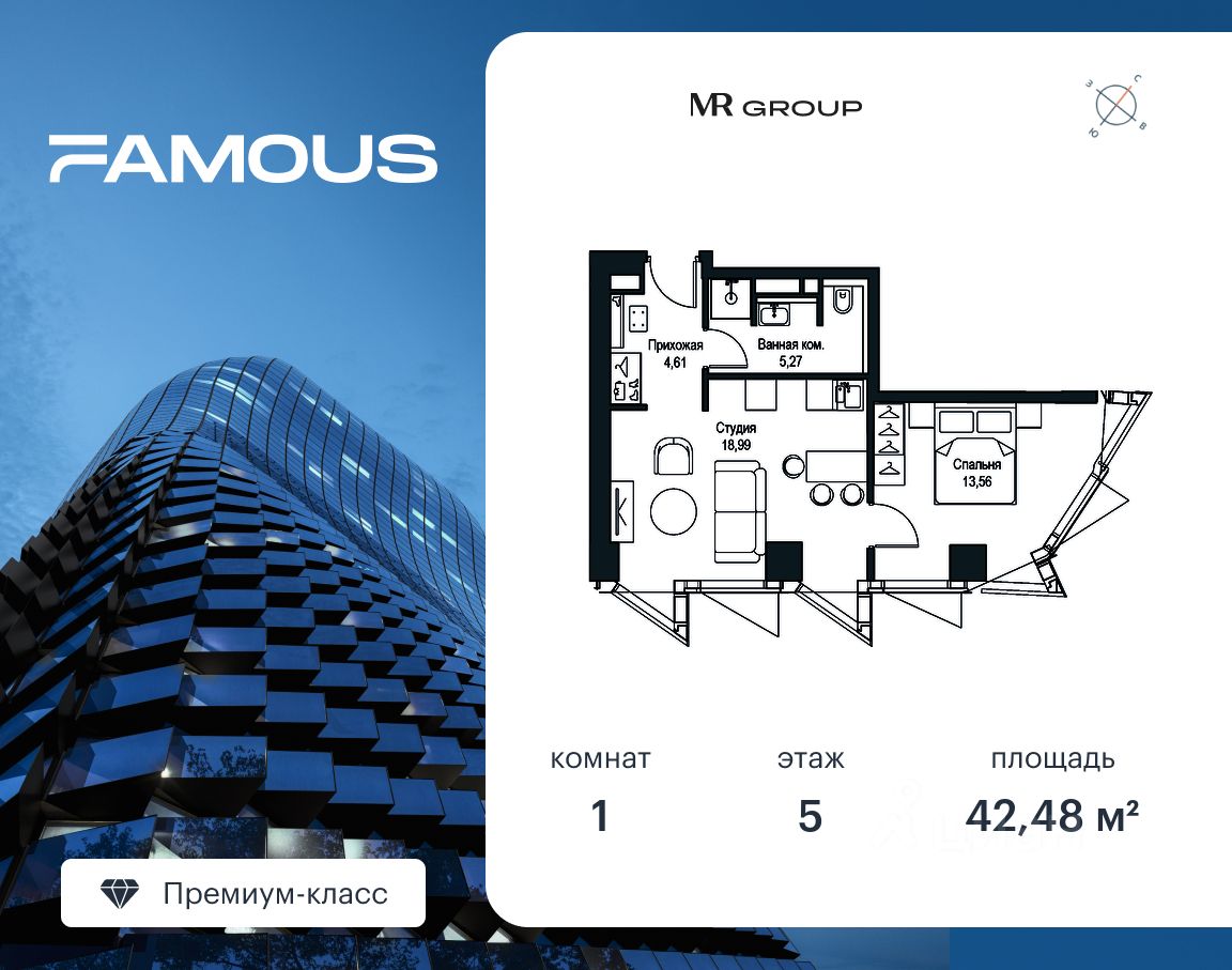 Продаётся 1-к квартира общей площадью 42.48 м² с предчистовой отделкой на 5-м этаже премиального небоскреба Famous.