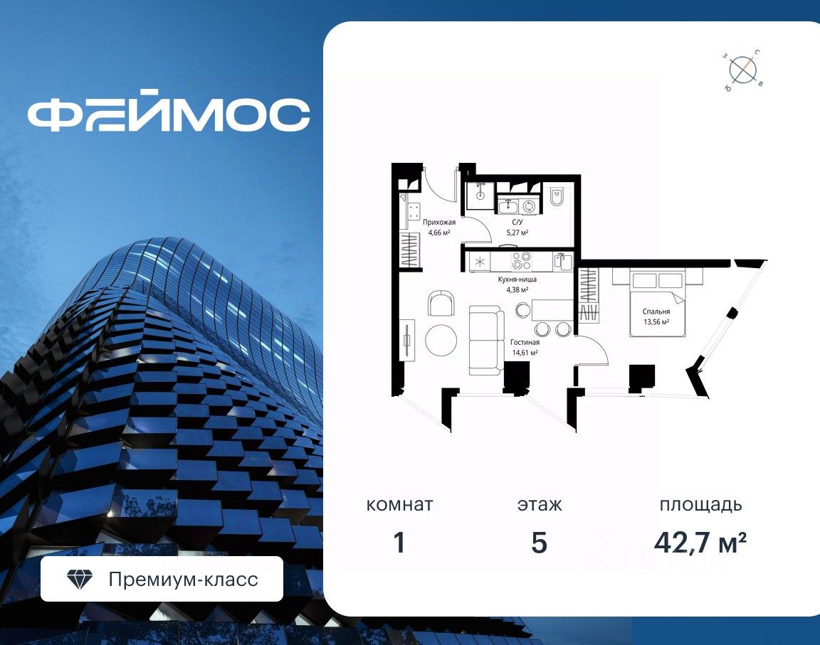 Продаётся 1-комнатная квартира общей площадью 42.70 м² с предчистовой отделкой на 5-м этаже премиального небоскреба Феймос.