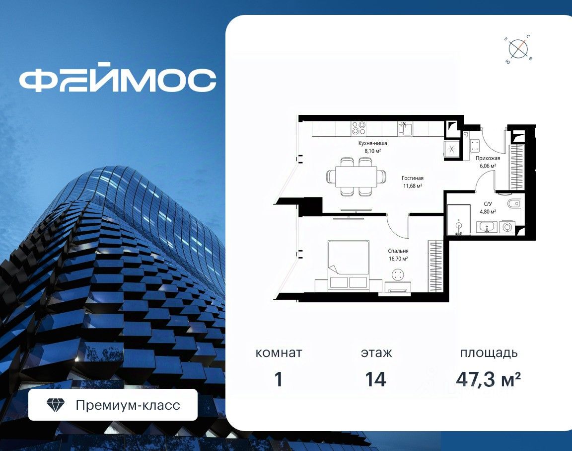 Продаётся 1-комнатная квартира общей площадью 47.30 м² с предчистовой отделкой на 14-м этаже премиального небоскреба Феймос.