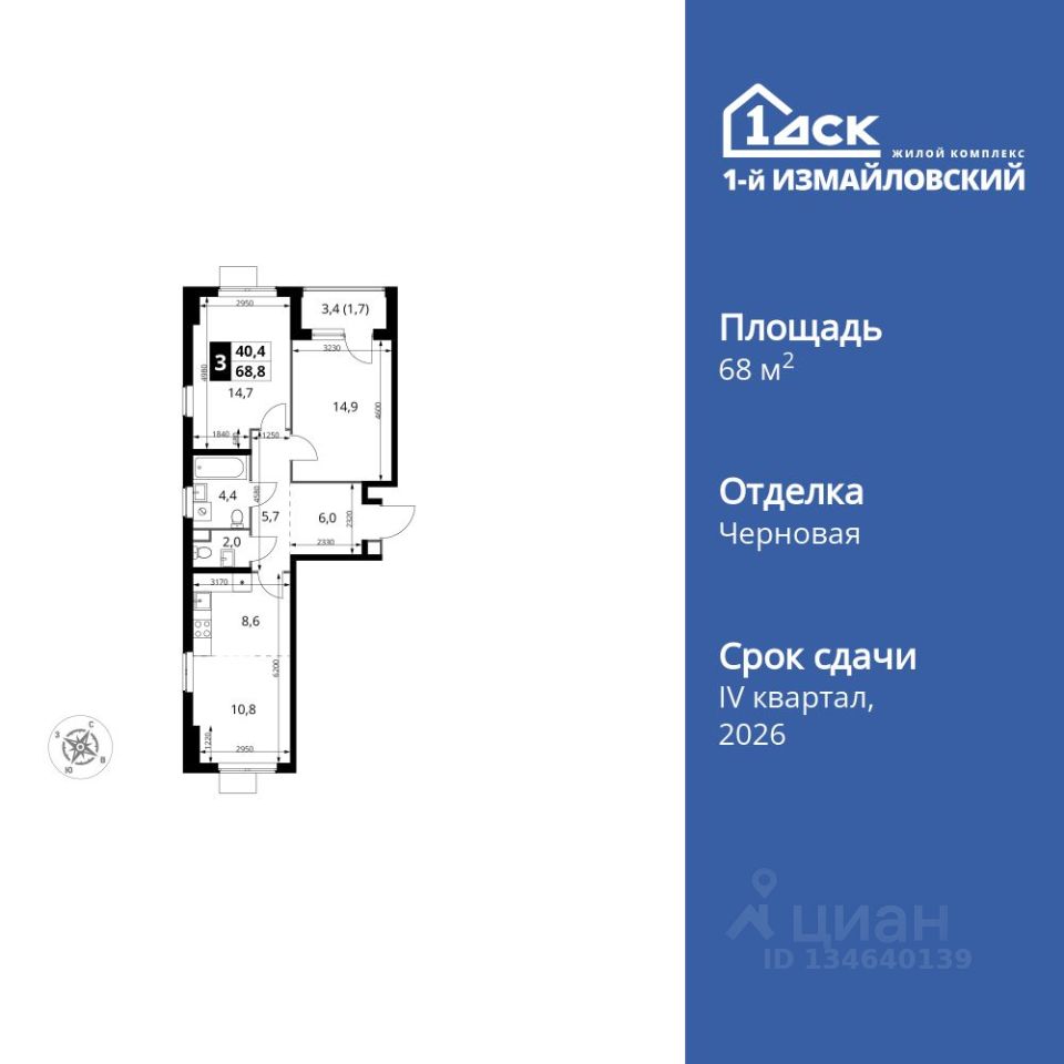 Продаётся 3-к квартира номер 298 общей площадью 68.8 кв.м. на 3-м этаже 12 этажного дома. Отделка Whitebox. Цена с учётом скидки!