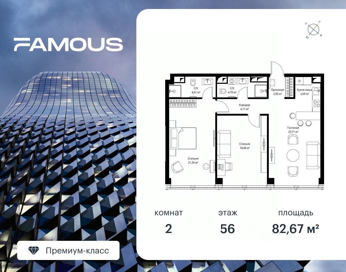 Продаётся 2-комнатная квартира площадью 82.67 м² с предчистовой отделкой на 56-м этаже премиального небоскреба Famous.