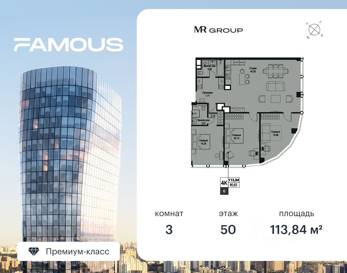 Продаётся 3-к квартира площадью 113.84 м² с предчистовой отделкой на 50-м этаже премиального небоскреба Famous.