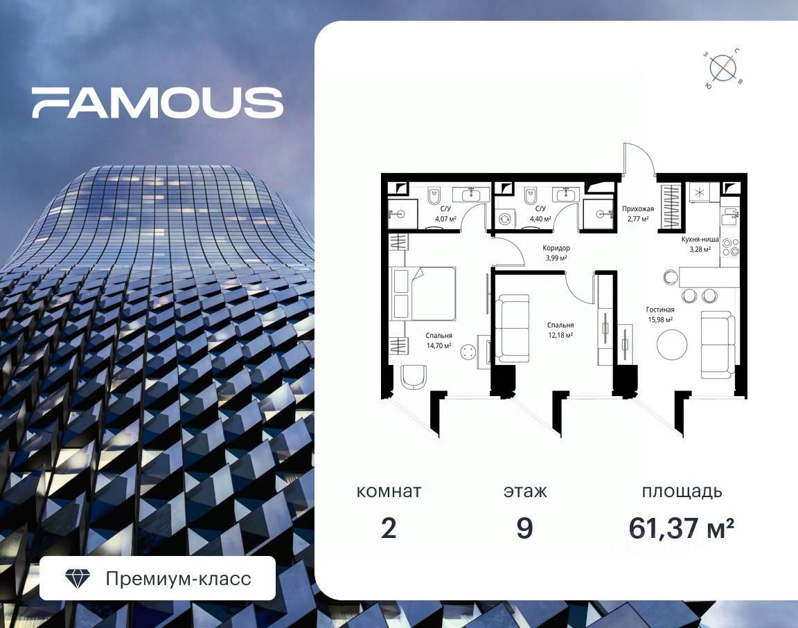 Продаётся 2-комнатная квартира площадью 61.37 м² с предчистовой отделкой на 9-м этаже премиального небоскреба Famous.
