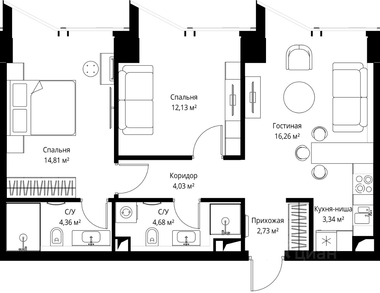Продаётся 2-комнатная квартира площадью 62.34 м² с предчистовой отделкой на 17-м этаже премиального небоскреба Famous.