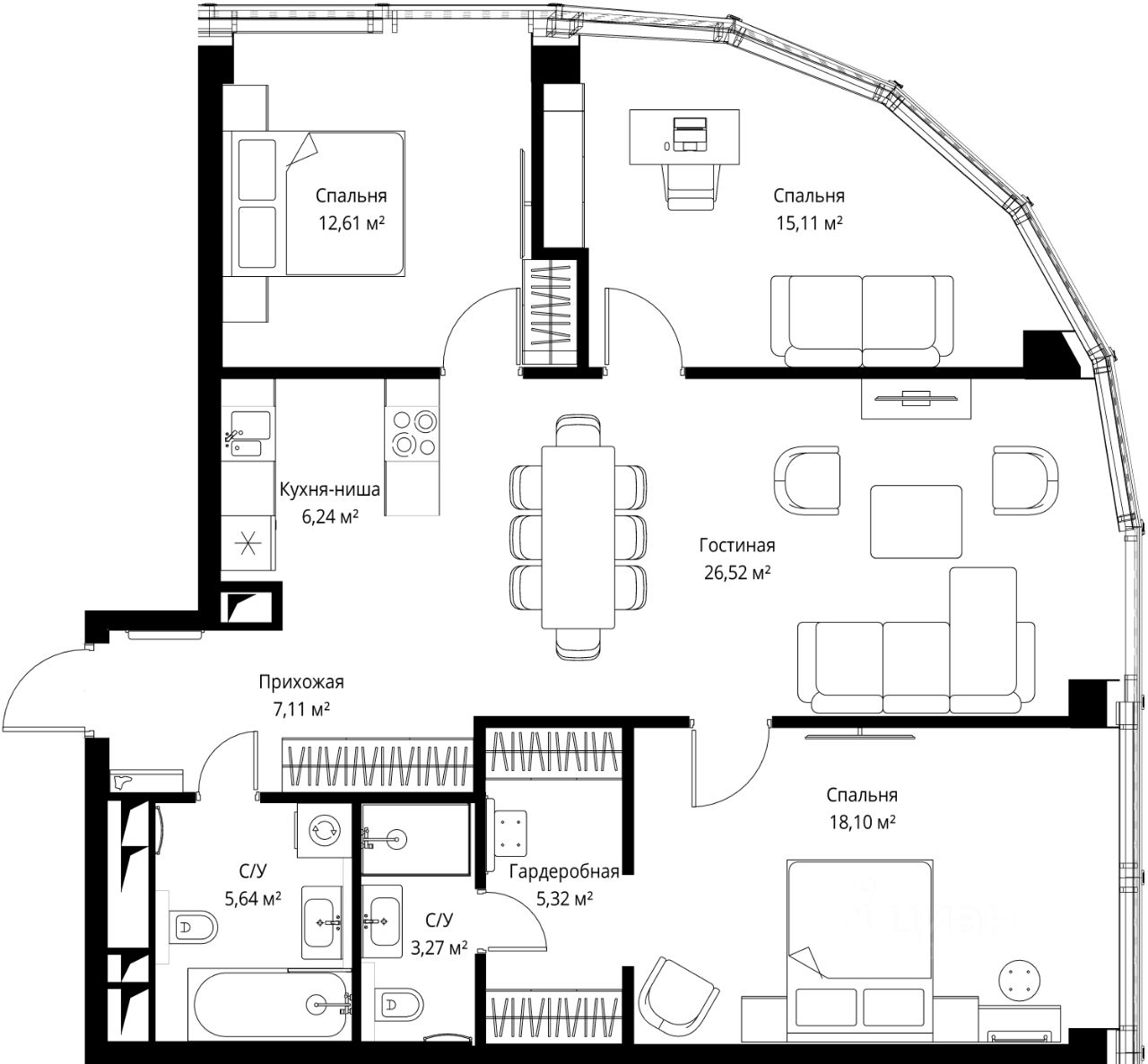 Продаётся 3-комнатная квартира площадью 99.92 м² с предчистовой отделкой на 48-м этаже премиального небоскреба Famous.