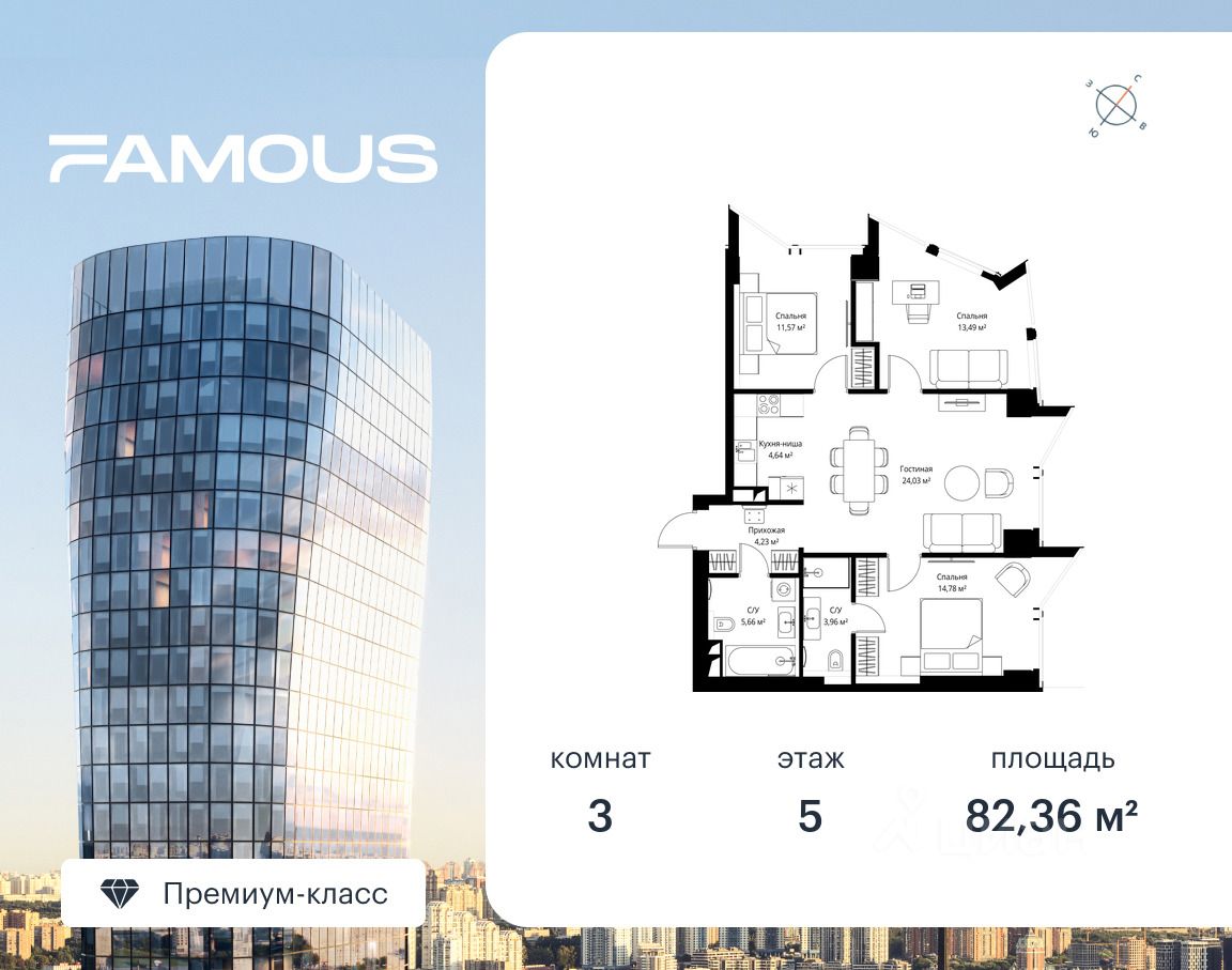 Продаётся 3-комнатная квартира площадью 82.36 м² с предчистовой отделкой на 5-м этаже премиального небоскреба Famous.