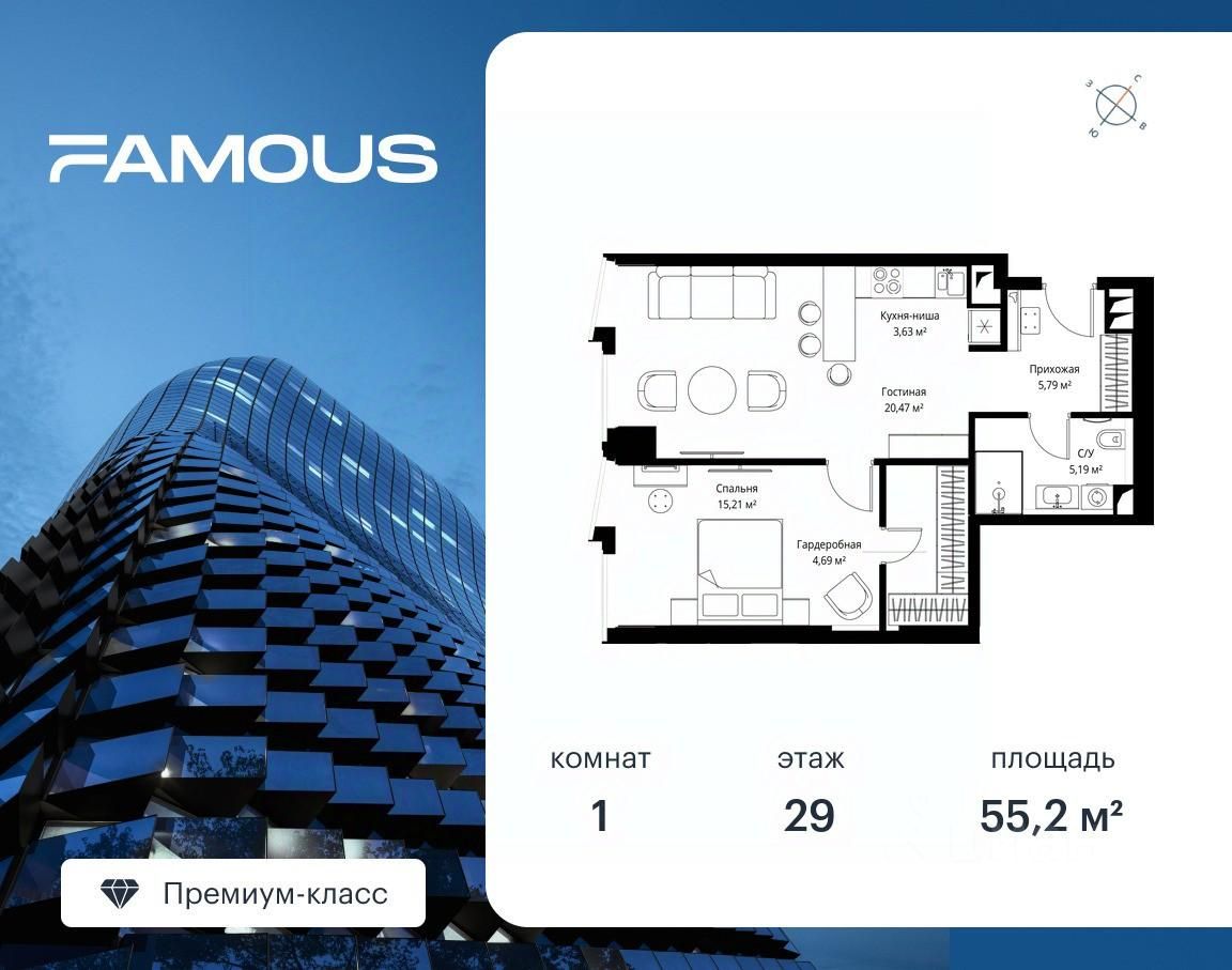 Продаётся 1-комнатная квартира общей площадью 55.20 м² с предчистовой отделкой на 29-м этаже премиального небоскреба Famous.