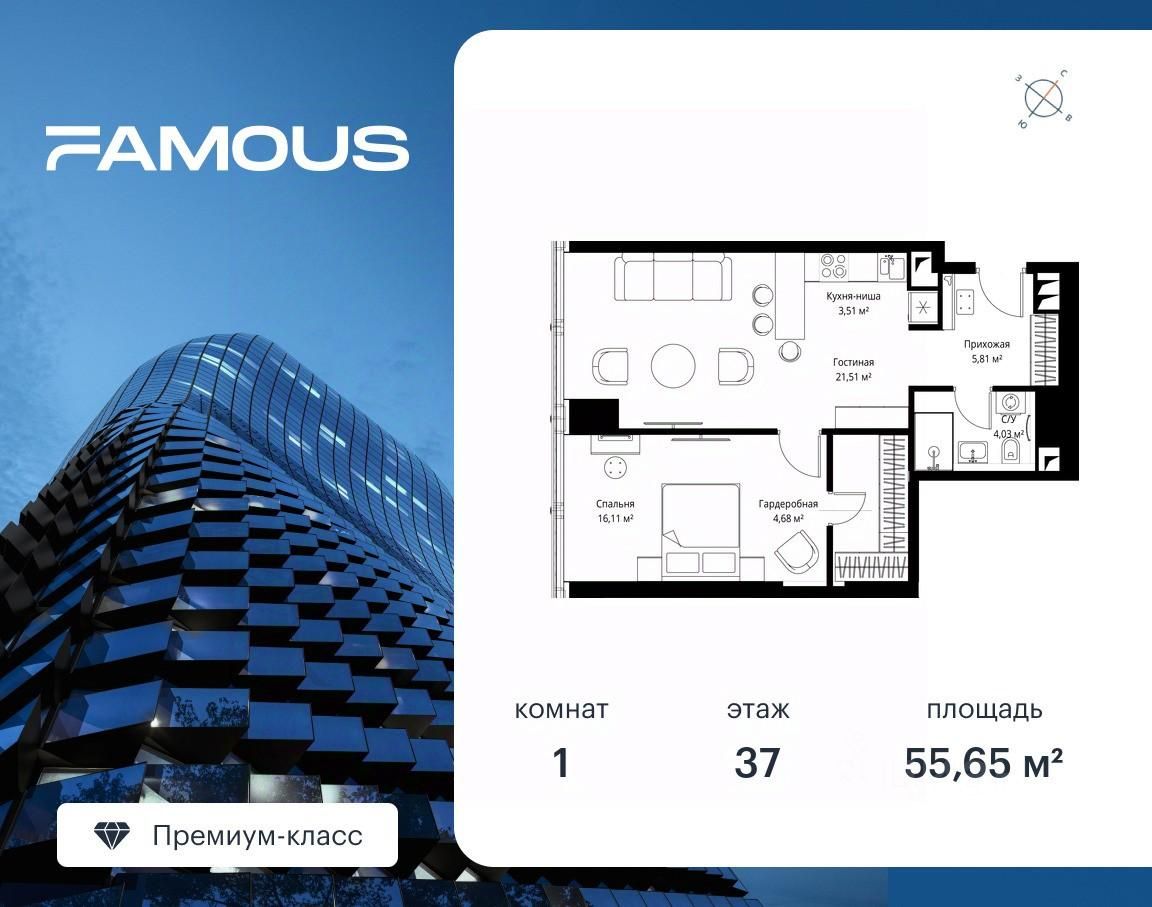 Продаётся 1-комнатная квартира общей площадью 55.65 м² с предчистовой отделкой на 37-м этаже премиального небоскреба Famous.