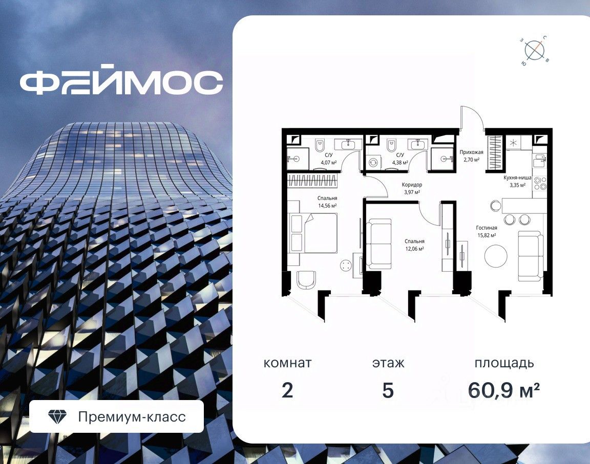 Продаётся 2-комнатная квартира площадью 60.90 м² с предчистовой отделкой на 5-м этаже премиального небоскреба Феймос.