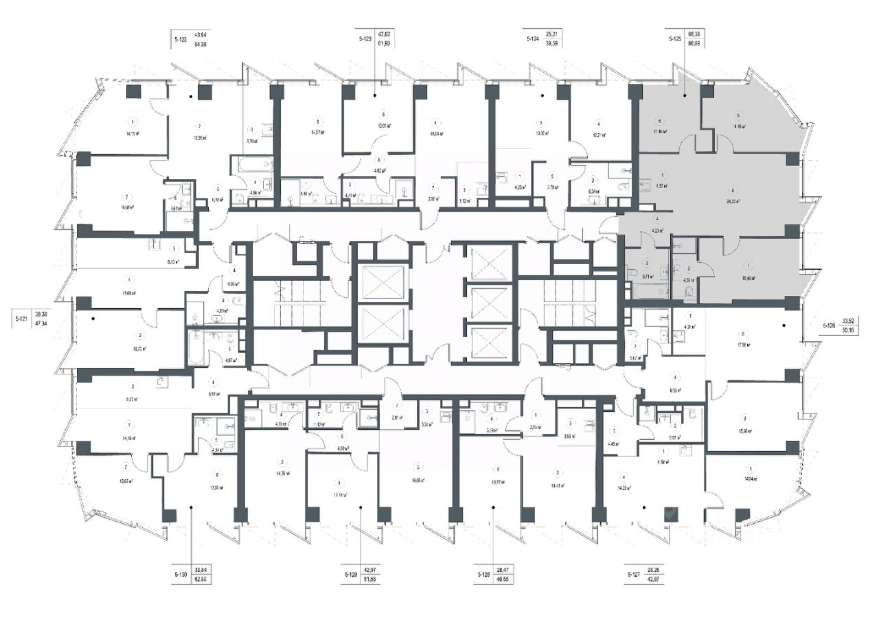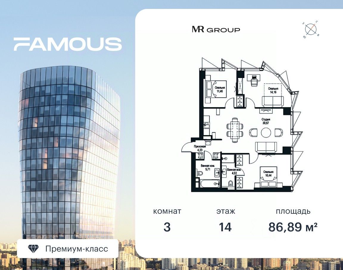 Продаётся 3-к квартира площадью 86.89 м² с предчистовой отделкой на 14-м этаже премиального небоскреба Famous.