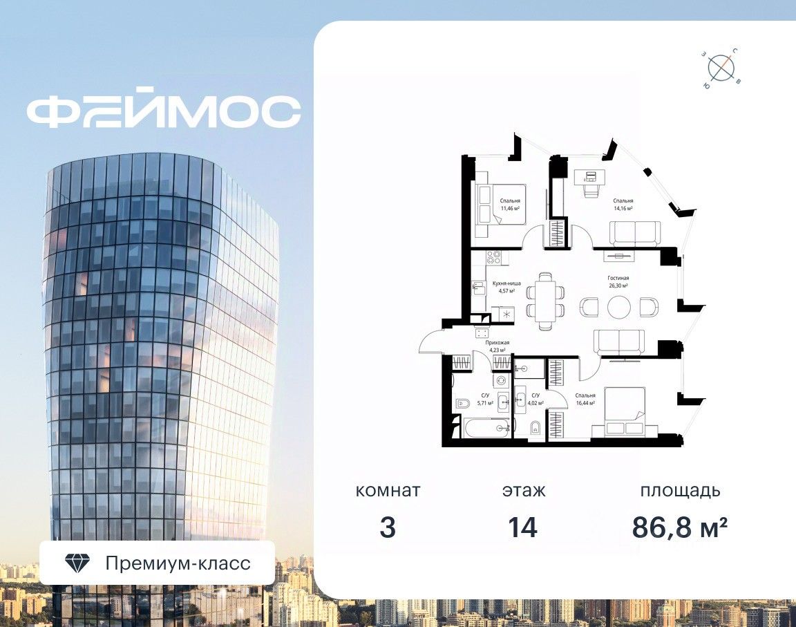 Продаётся 3-комнатная квартира площадью 86.80 м² с предчистовой отделкой на 14-м этаже премиального небоскреба Феймос.