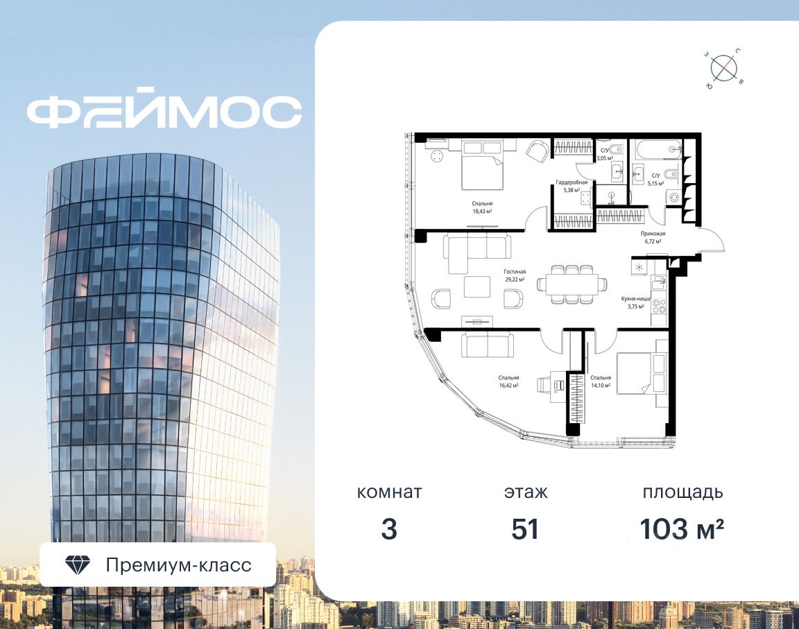 Продаётся 3-комнатная квартира площадью 103 м² с предчистовой отделкой на 51-м этаже премиального небоскреба Феймос.