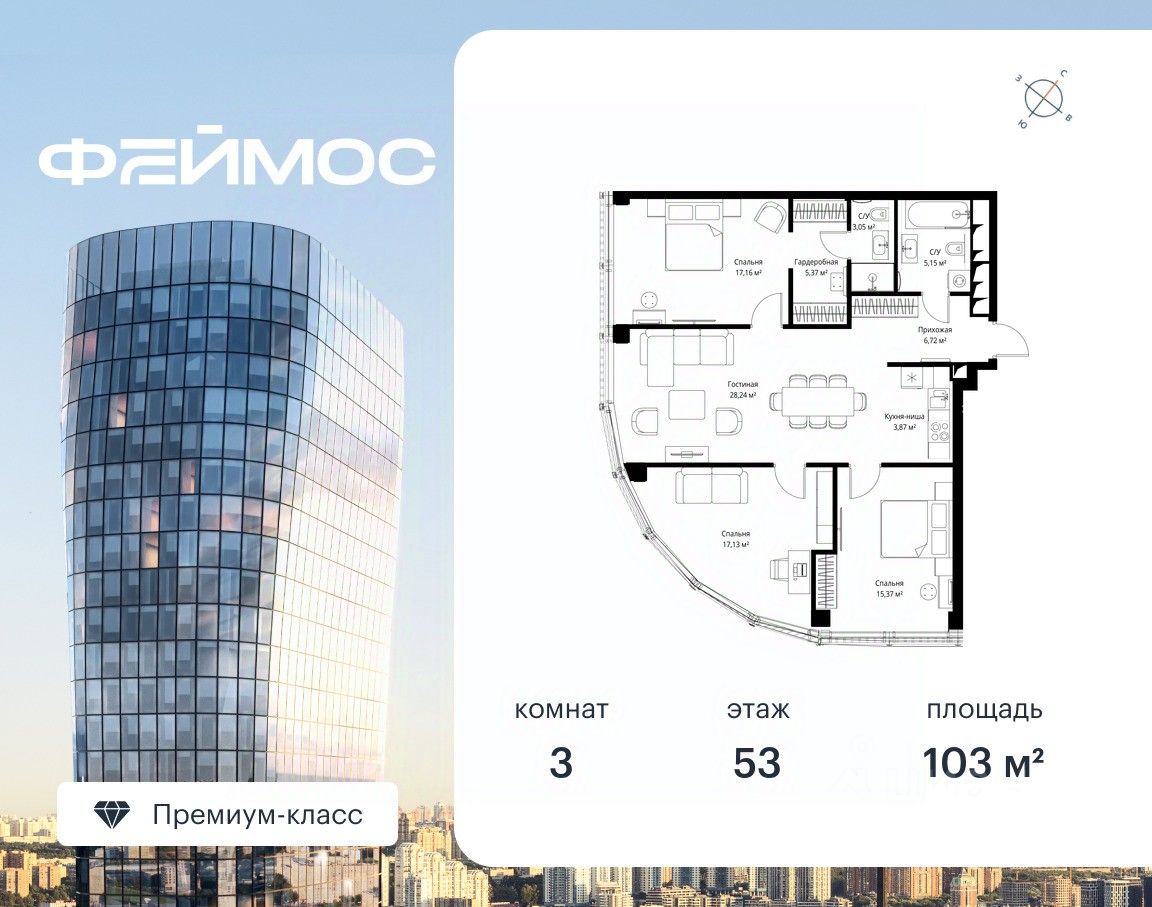 Продаётся 3-комнатная квартира площадью 103 м² с предчистовой отделкой на 53-м этаже премиального небоскреба Феймос.
