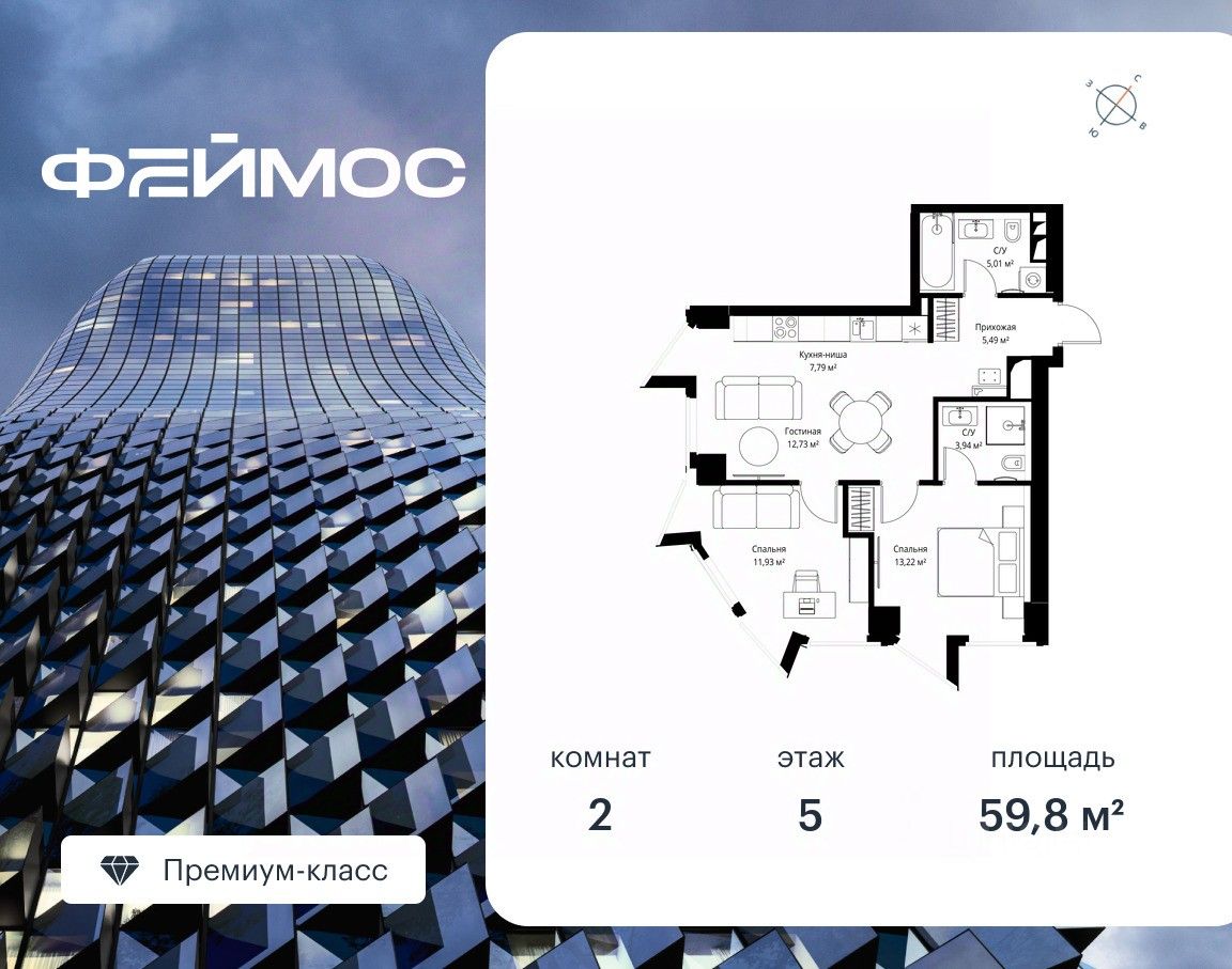 Продаётся 2-комнатная квартира площадью 59.80 м² с предчистовой отделкой на 5-м этаже премиального небоскреба Феймос.