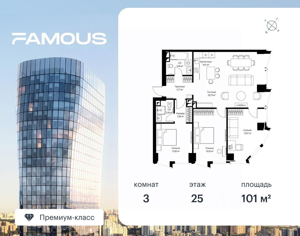 Продаётся 3-комнатная квартира площадью 101 м² с предчистовой отделкой на 25-м этаже премиального небоскреба Famous.