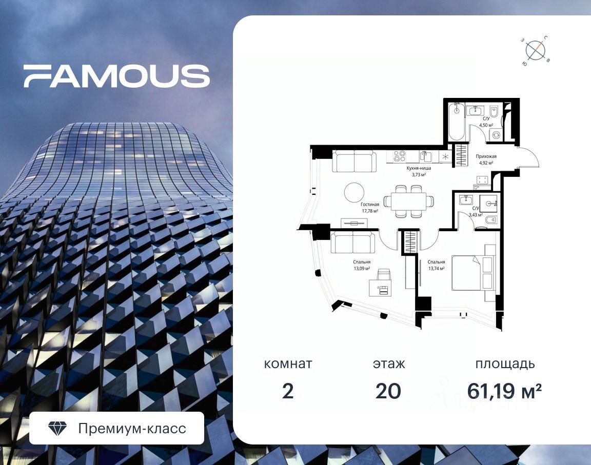 Продаётся 2-комнатная квартира площадью 61.19 м² с предчистовой отделкой на 20-м этаже премиального небоскреба Famous.