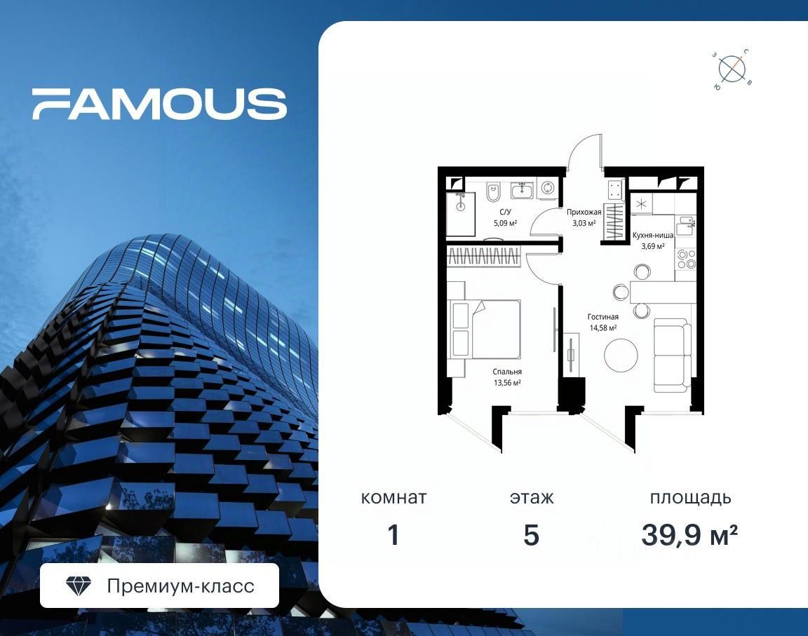 Продаётся 1-комнатная квартира общей площадью 39.90 м² с предчистовой отделкой на 5-м этаже премиального небоскреба Феймос.