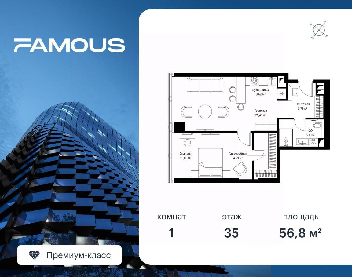 Продаётся 1-комнатная квартира общей площадью 56.80 м² с предчистовой отделкой на 35-м этаже премиального небоскреба Famous.