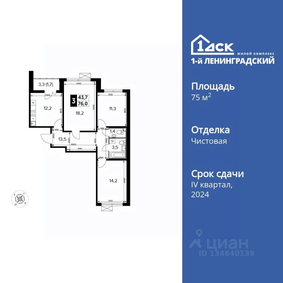 Продаётся 3-к квартира номер 181 общей площадью 75.9 кв.м. на 13-м этаже 13 этажного здания. Чистовая отделка. Цена с учётом скидки.