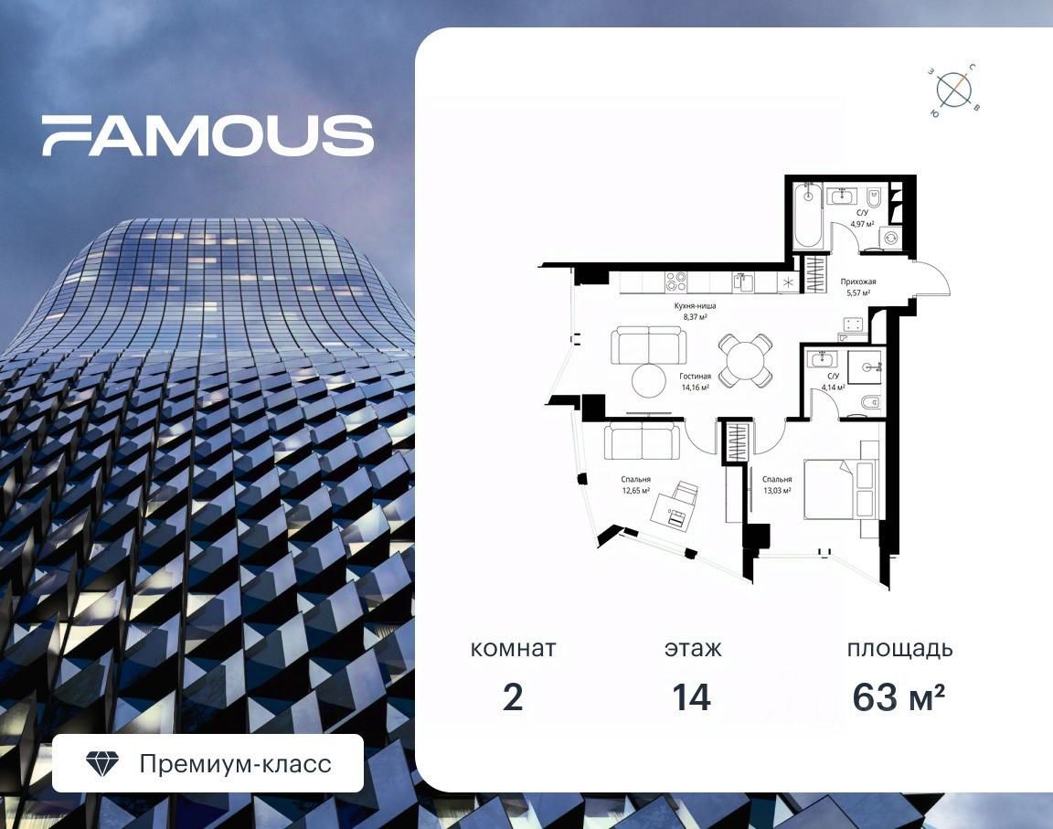 Продаётся 2-комнатная квартира площадью 63 м² с предчистовой отделкой на 14-м этаже премиального небоскреба Famous.