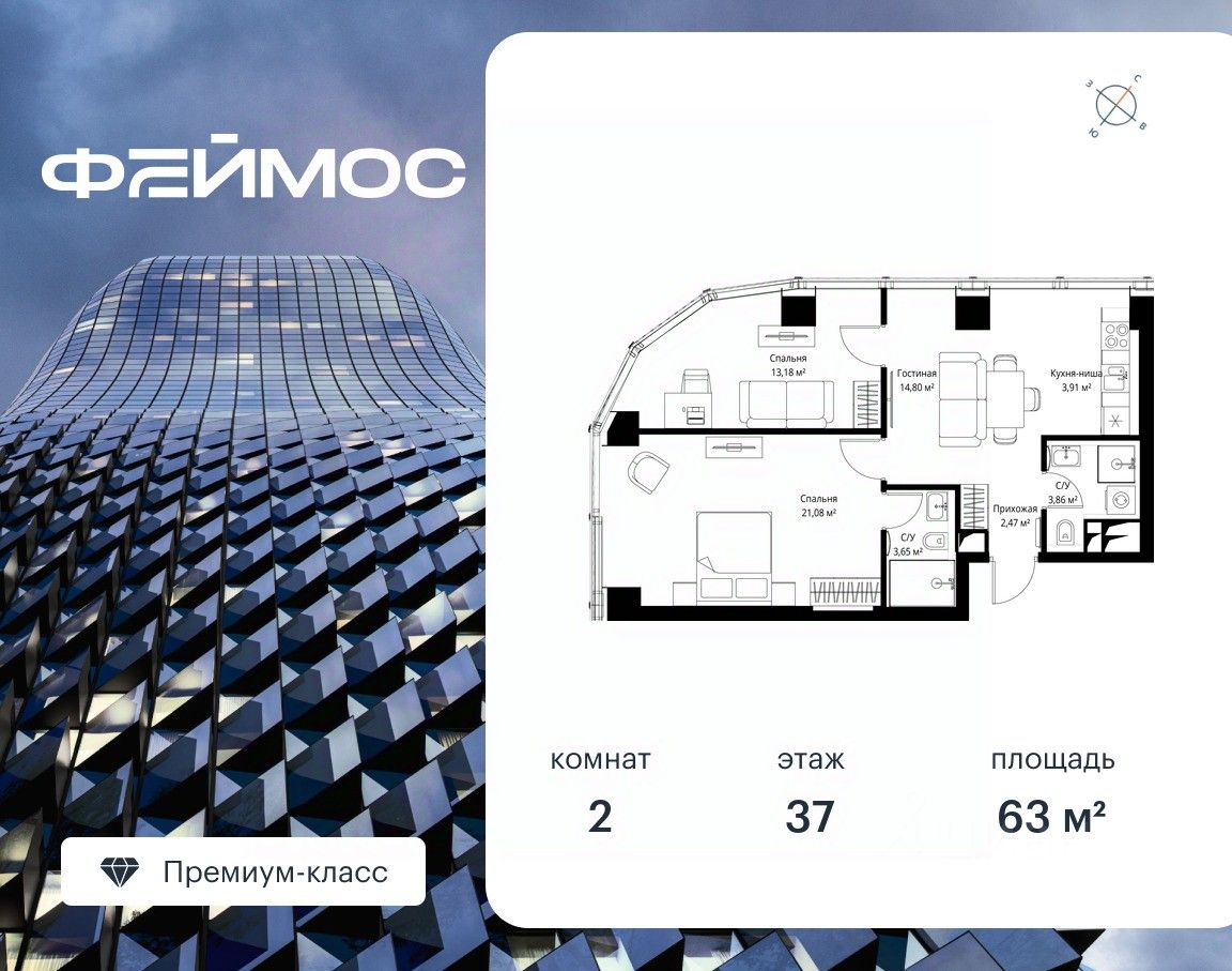 Продаётся 2-комнатная квартира площадью 63 м² с предчистовой отделкой на 37-м этаже премиального небоскреба Феймос.