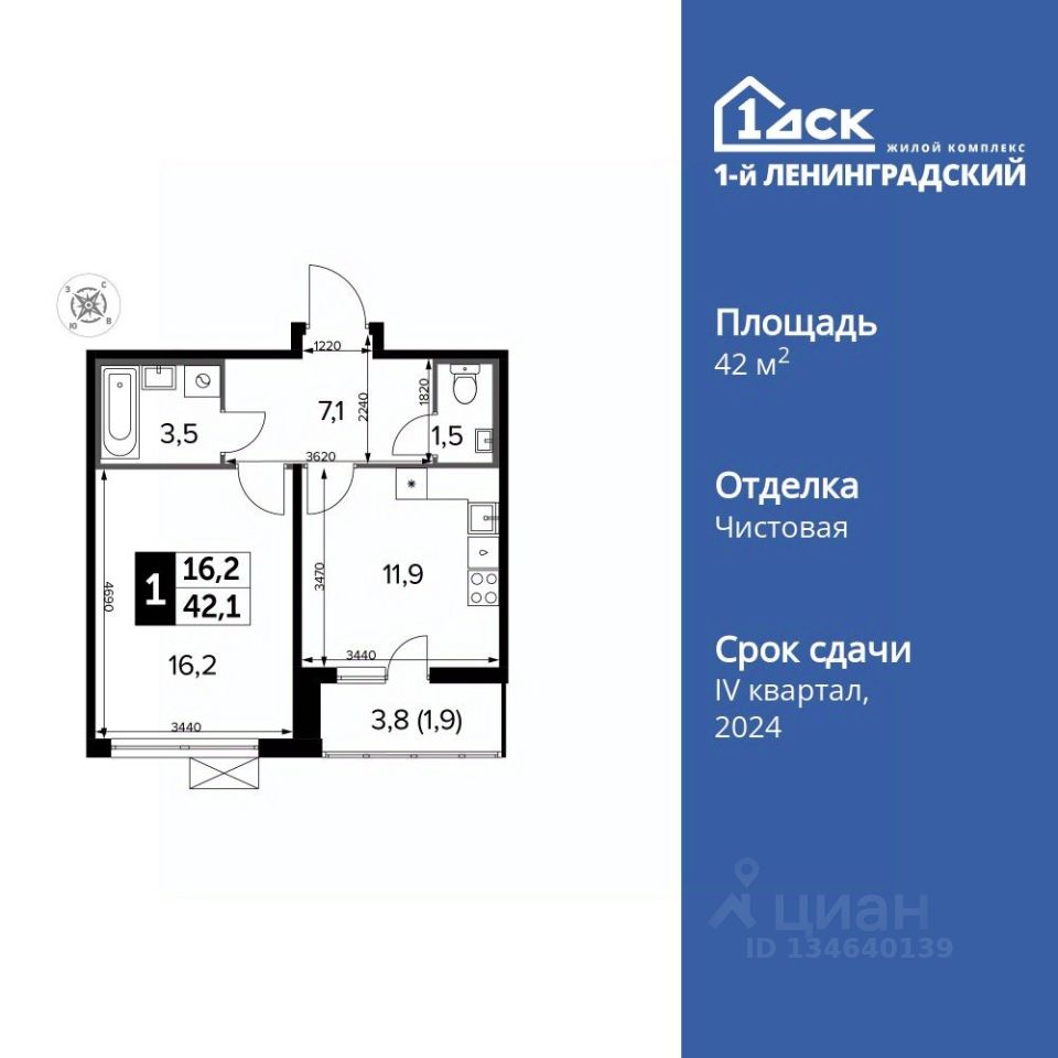 Продаётся 1-к квартира номер 342 общей площадью 42.1 кв.м. на 5-м этаже 13 этажного здания. Чистовая отделка.