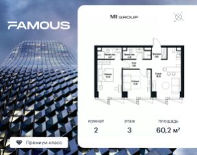 Продаётся 2-к квартира площадью 60.20 м² с предчистовой отделкой на 3-м этаже премиального небоскреба Famous.
