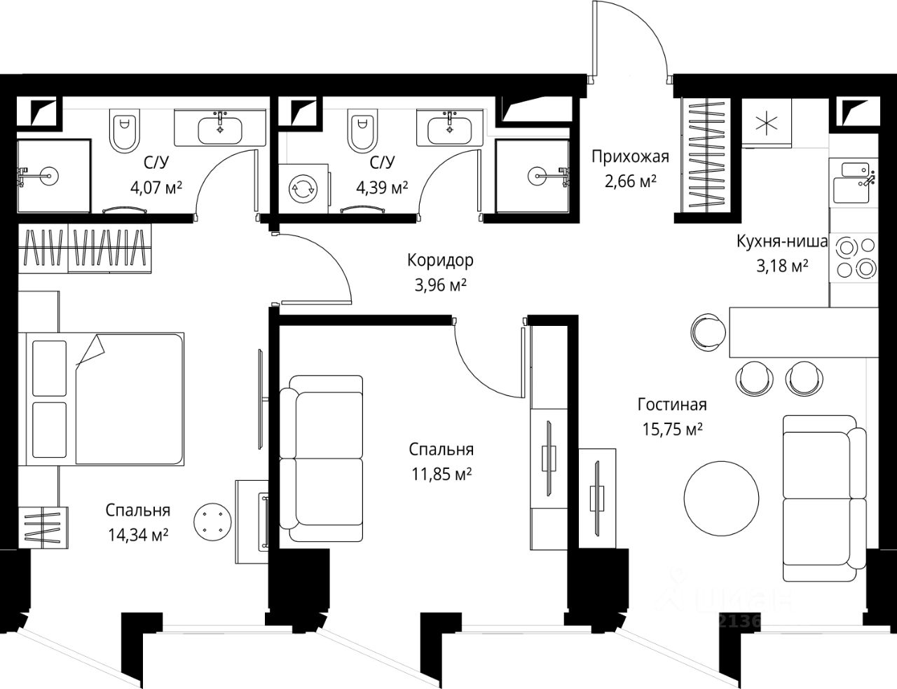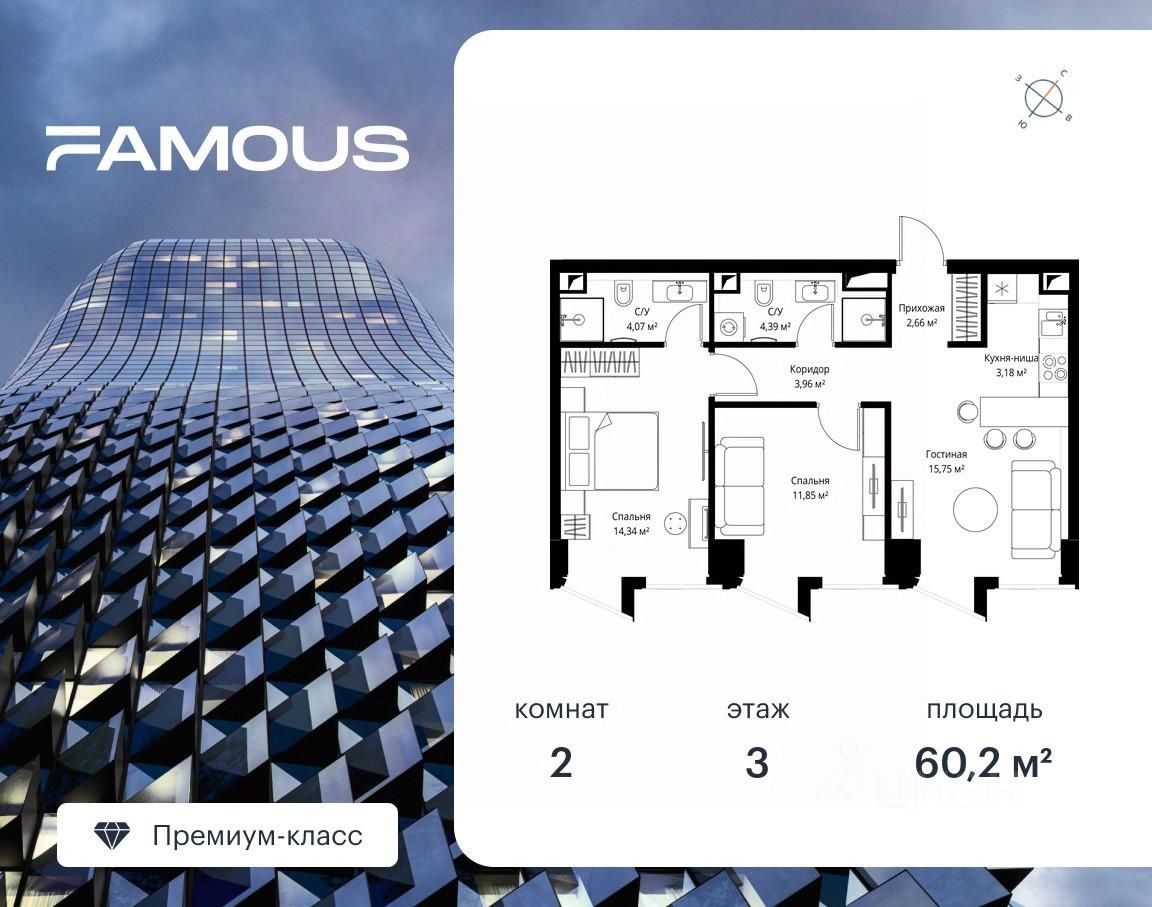 Продаётся 2-комнатная квартира площадью 60.20 м² с предчистовой отделкой на 3-м этаже премиального небоскреба Famous.