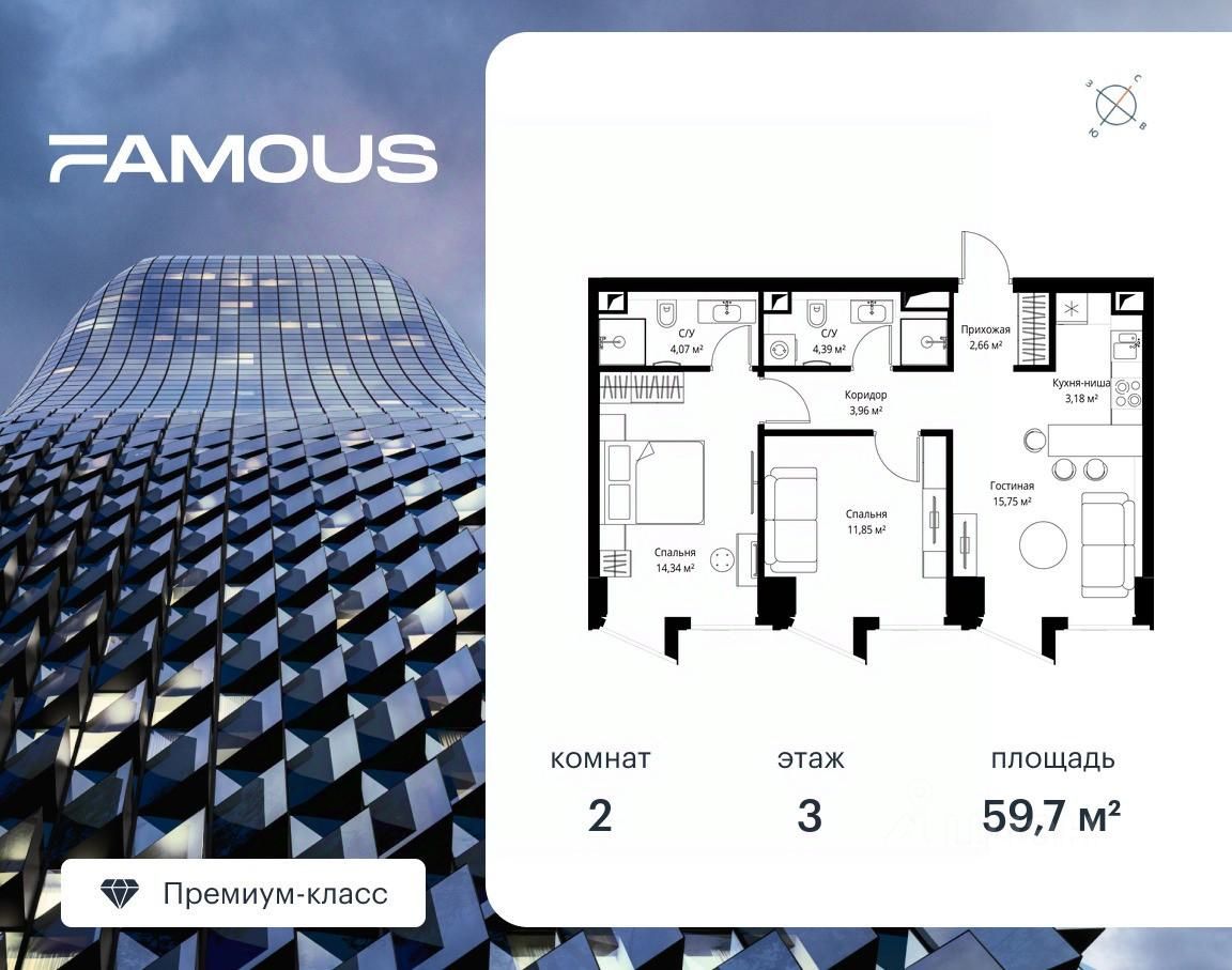 Продаётся 2-комнатная квартира площадью 59.70 м² с предчистовой отделкой на 3-м этаже премиального небоскреба Famous.