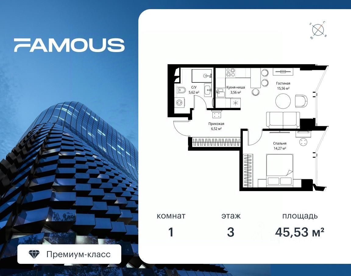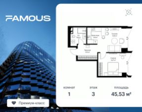 Продаётся 1-комнатная квартира общей площадью 45.53 м² с предчистовой отделкой на 3-м этаже премиального небоскреба Famous.