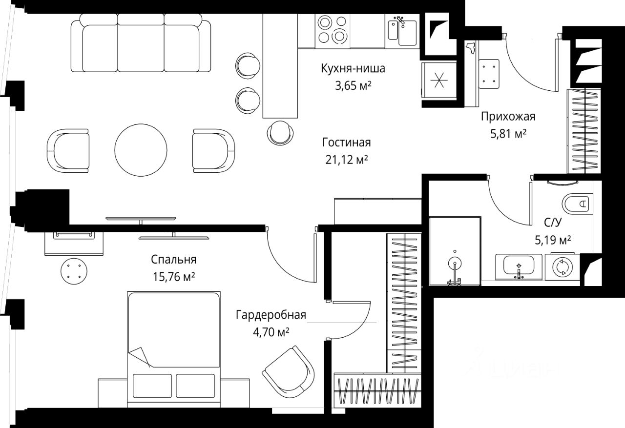 Продаётся 1-комнатная квартира общей площадью 56.23 м² с предчистовой отделкой на 31-м этаже премиального небоскреба Famous.