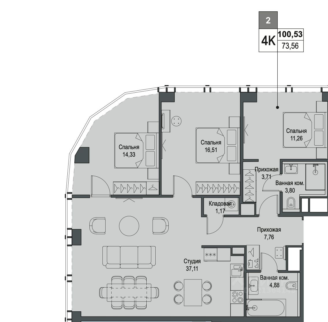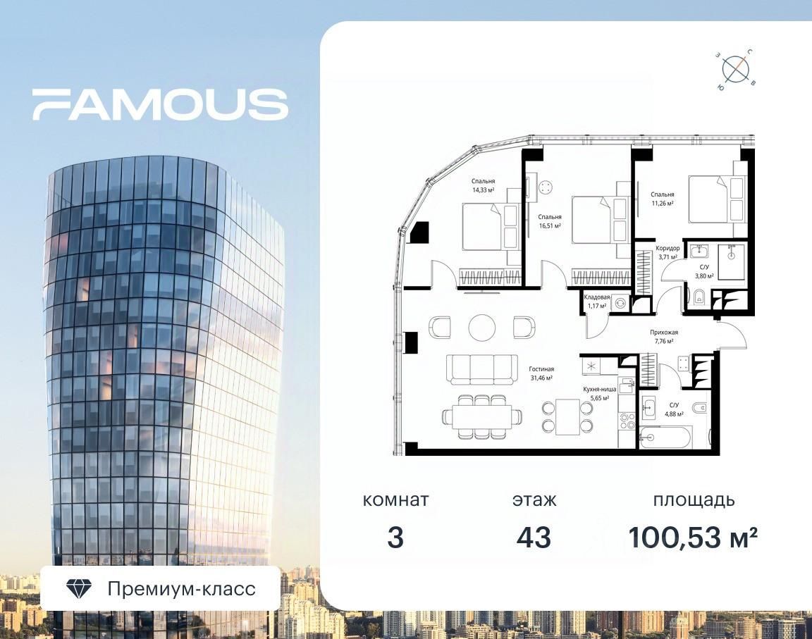 Продаётся 3-комнатная квартира площадью 100.53 м² с предчистовой отделкой на 43-м этаже премиального небоскреба Famous.