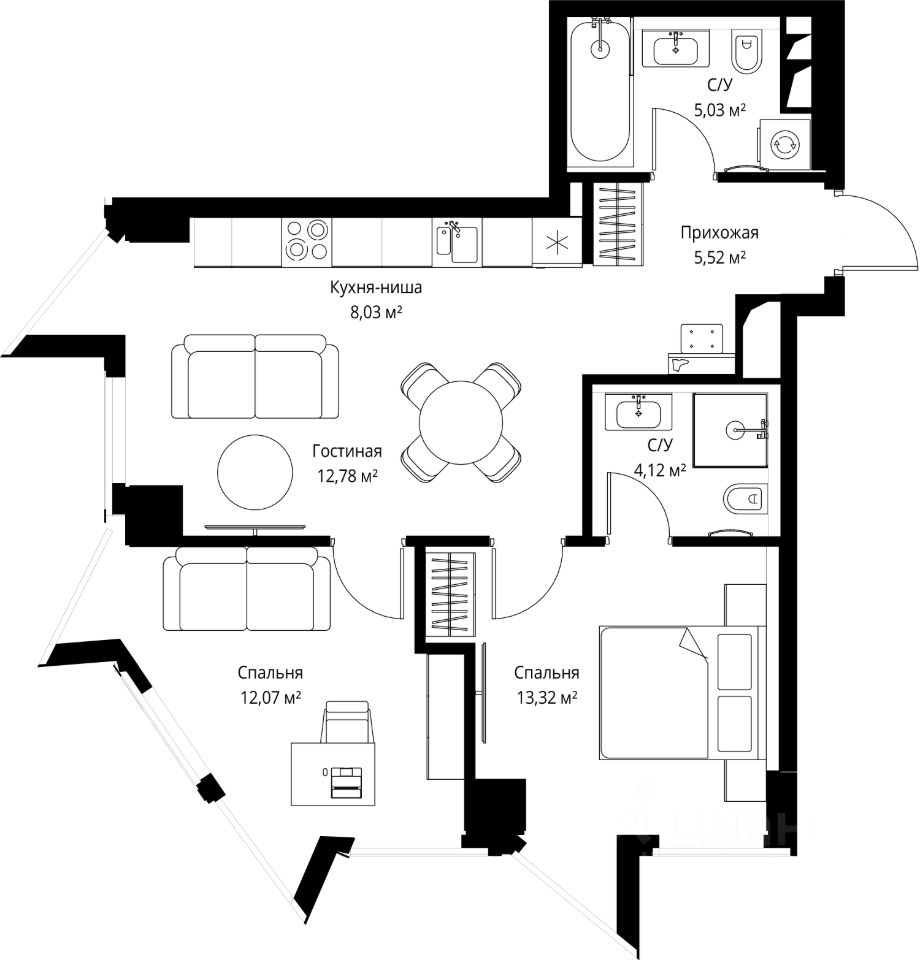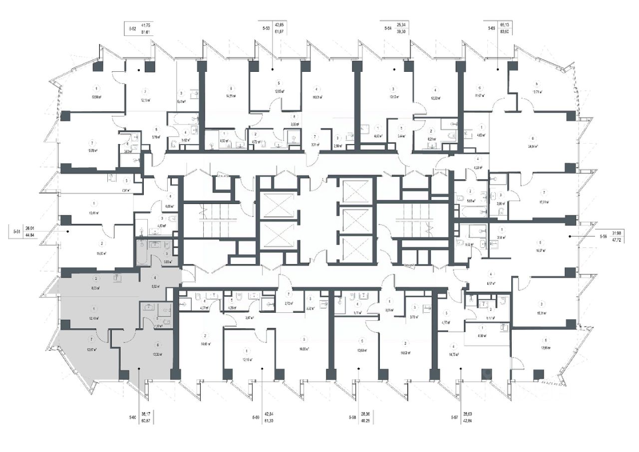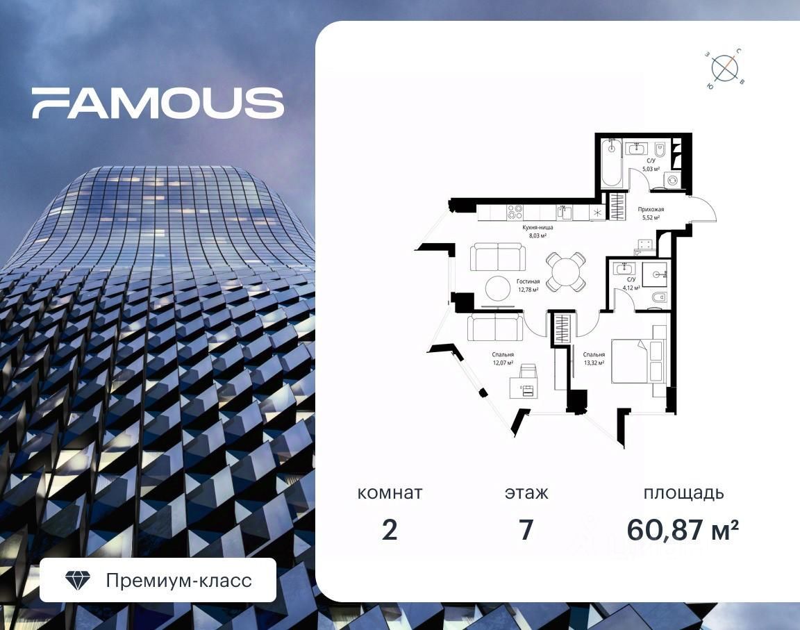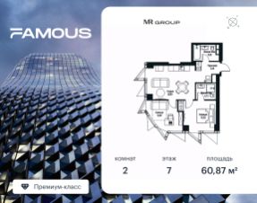 Продаётся 2-комнатная квартира площадью 60.87 м² с предчистовой отделкой на 7-м этаже премиального небоскреба Famous.