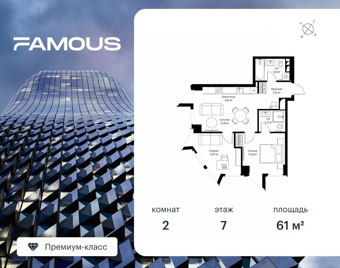 Продаётся 2-комнатная квартира площадью 61 м² с предчистовой отделкой на 7-м этаже премиального небоскреба Famous.