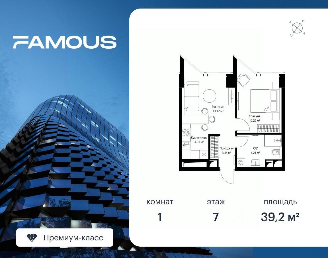 Продаётся 1-комнатная квартира общей площадью 39.20 м² с предчистовой отделкой на 7-м этаже премиального небоскреба Famous.