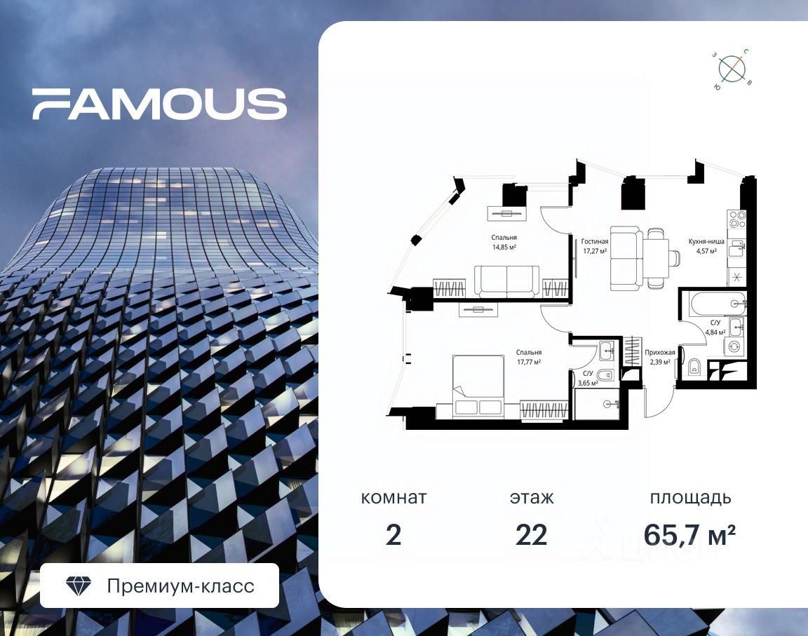 Продаётся 2-комнатная квартира площадью 65.70 м² с предчистовой отделкой на 22-м этаже премиального небоскреба Famous.