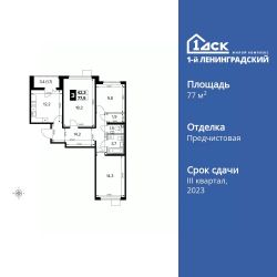 Продаётся 3-к квартира номер 467 общей площадью 77.8 кв.м. на 3-м этаже 15 этажного здания. Отделка Whitebox. Цена с учётом скидки.