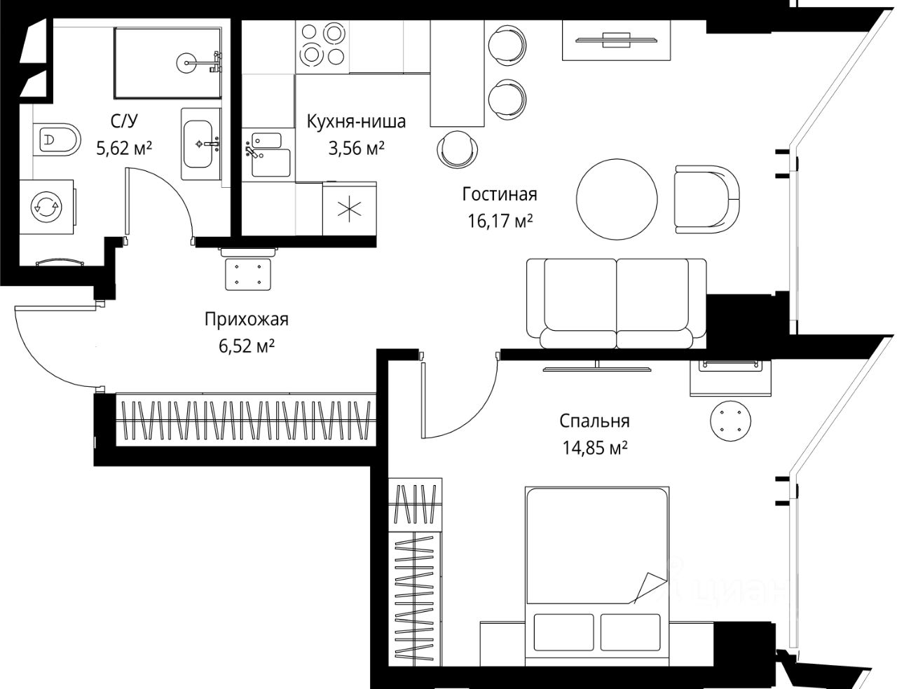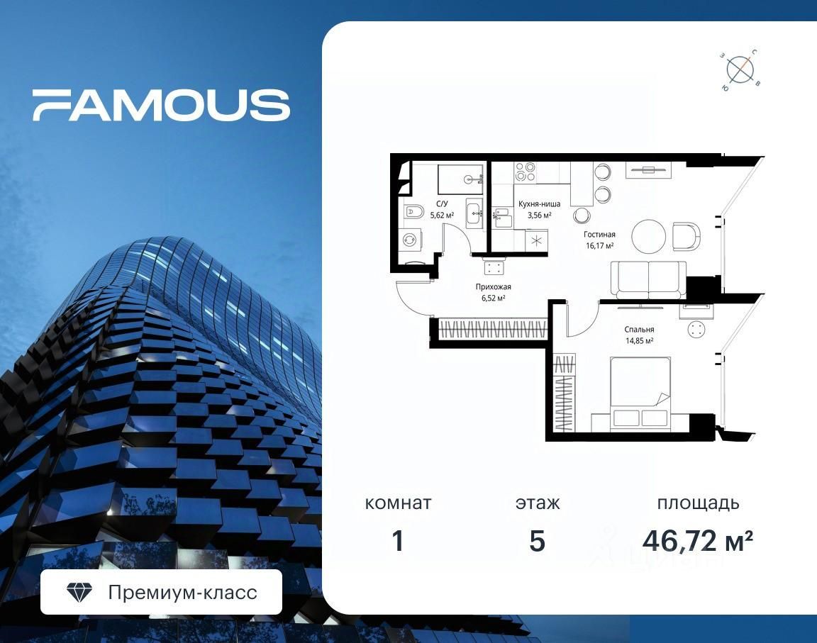 Продаётся 1-комнатная квартира общей площадью 46.72 м² с предчистовой отделкой на 5-м этаже премиального небоскреба Famous.