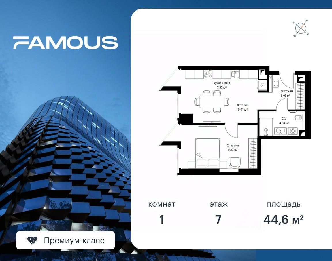 Продаётся 1-комнатная квартира общей площадью 44.60 м² с предчистовой отделкой на 7-м этаже премиального небоскреба Famous.
