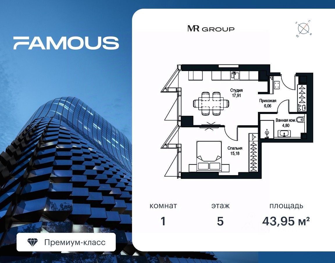 Продаётся 1-к квартира общей площадью 43.95 м² с предчистовой отделкой на 5-м этаже премиального небоскреба Famous.