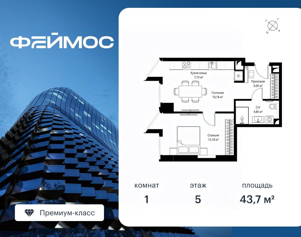 Продаётся 1-комнатная квартира общей площадью 43.70 м² с предчистовой отделкой на 5-м этаже премиального небоскреба Феймос.
