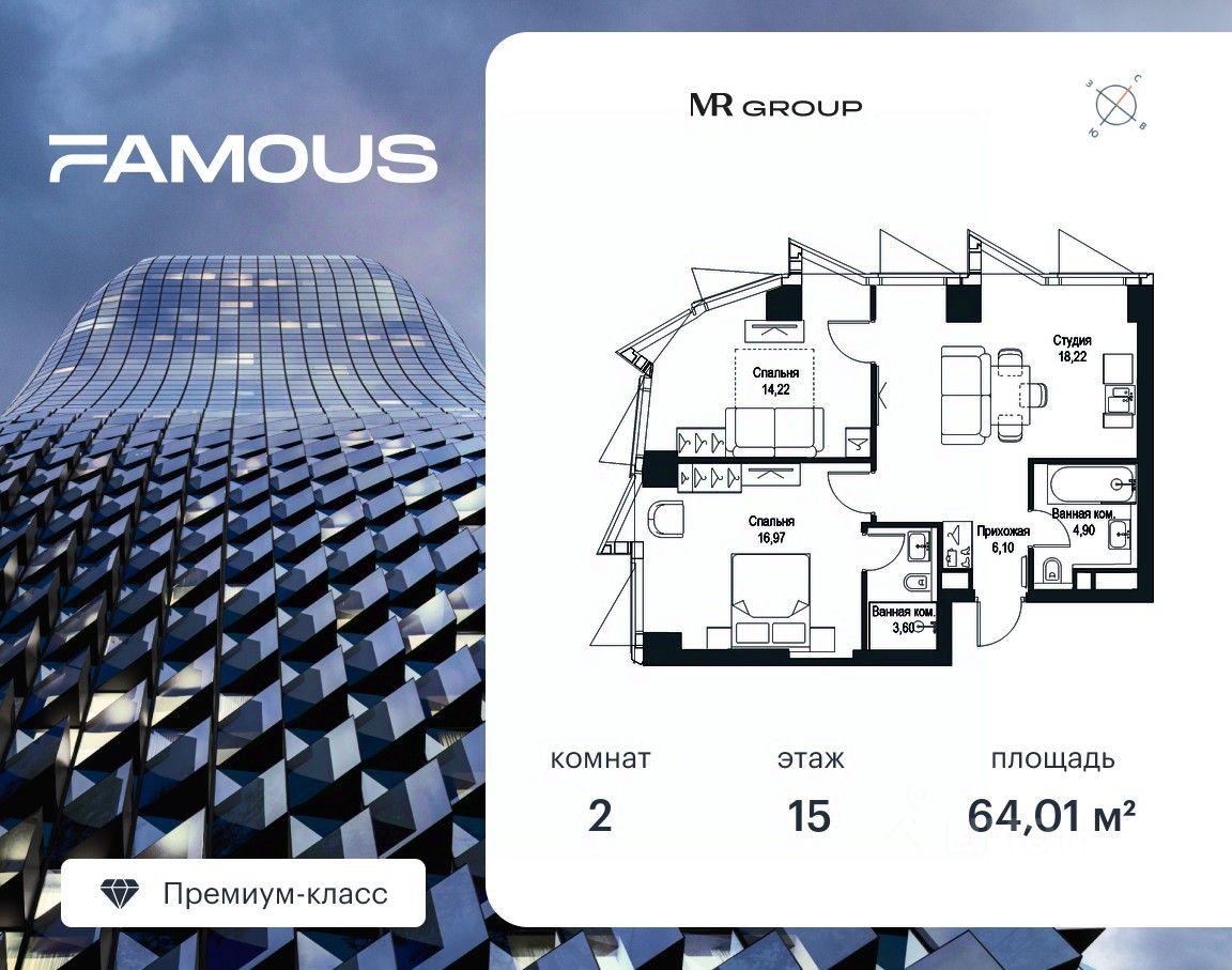 Продаётся 2-к квартира площадью 64.01 м² с предчистовой отделкой на 15-м этаже премиального небоскреба Famous.