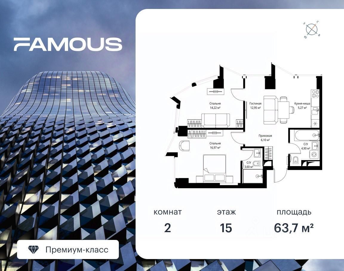 Продаётся 2-комнатная квартира площадью 63.70 м² с предчистовой отделкой на 15-м этаже премиального небоскреба Феймос.