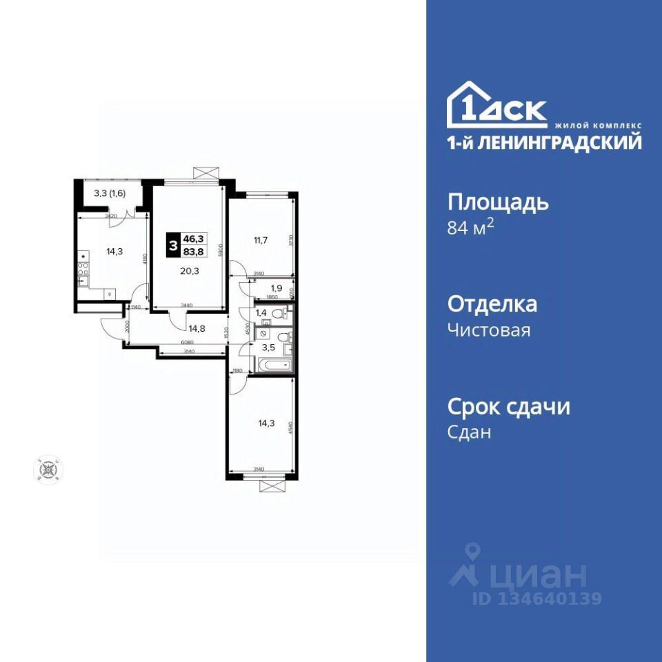 Продаётся 3-к квартира номер 617 общей площадью 84 кв.м. на 13-м этаже 14 этажного здания. Чистовая отделка. Цена с учётом скидки.